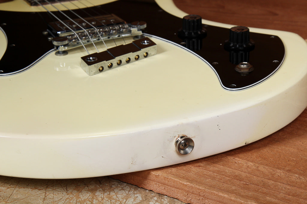 This is a 1979 Guild S60 in creme finish. Just an amazing guitar. I sell guitars full time for my living and this came through my door in April 2016 and I haven't been able to part with it until now. In the meantime I've sold a couple hundred other guitars, but this is the only one I've kept from my stock in that time--that's how good it is. I recently used it for some recording and it sounded great, but I realize I don't use it enough to keep it. The only guitar I like better is my Joan Jett Melody Maker and that's all I really need. Anyway, these guitars have an amazing sounding single bridge humbucker. Lots of chime and clarity, but plenty of meat for a thick distortion sound. The simple Volume/Tone controls feature the Guild "G-Shield" knobs and you can get a lot of tones using the Tone pot.